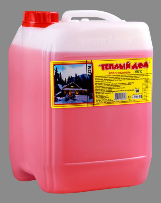 "Топла къща" - течност, която може да се използва за приготвяне на готов разтвор, който се излива в отоплителната система. Пропорциите на съставките ще повлияят на температурата, при която те започват да замръзват или кристализират. По този начин, ако 77 литра охлаждаща течност се добавят към 23 литра вода, температурата на началото на замръзването ще остане около -40 ° С.