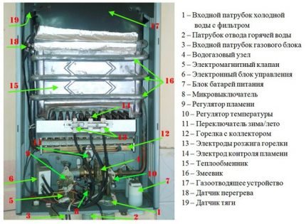 Когато кранът се отвори, водата се подава през входящата тръба към водогазовия агрегат, който включва запалването и подаването на газ. Веднага щом се запали, от сензора на пламъка до електронния блок се изпраща сигнал за спиране на искренето.