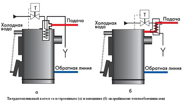 В повечето случаи производителите препоръчват използването на чешмяна вода за охлаждане в информационния лист за нагревател. В някои случаи котлите на твърдо гориво са оборудвани с вградени допълнителни топлообменници. Има модели котли с външни топлообменници. Използва се от предпазен клапан за предотвратяване на прегряване. Предпазният клапан е проектиран само за облекчаване на прекомерното налягане в системата, докато предпазният клапан отваря достъп до чешмяна вода, когато котелът прегрее.