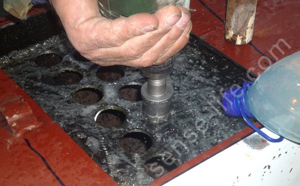 За да не се прегрее коронката и да не отлети победоносното запояване, мястото на сондиране трябва непрекъснато да се полива със сапунена вода. За тези цели можете да използвате патладжан с минерална вода с щампован корк.