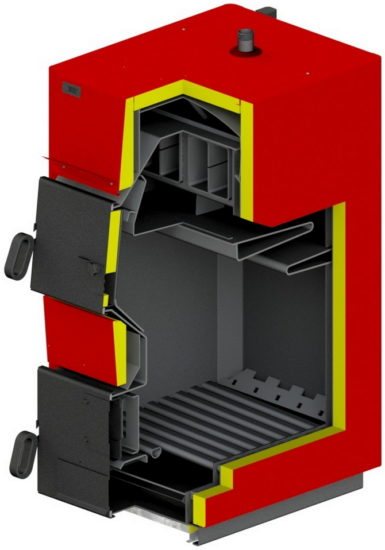 - Горивна камера. Изработен е от чугун или стомана. Котелът може да бъде с една или две камини (по-удобно). При двойната версия в горната част се изгарят дърва за огрев, а в долната е инсталирана газова горелка.