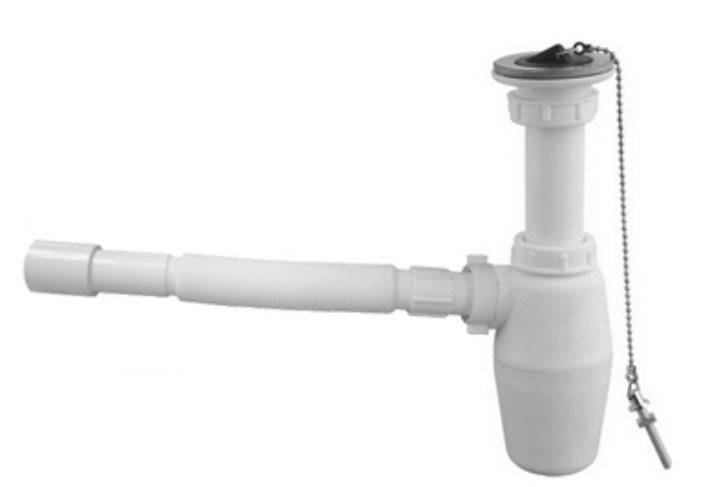 - Бутилирано. Днес те са най-популярни сред потребителите. По своята форма такива сифони наподобяват бутилка, поради което и са получили името си. Такова устройство е инсталирано директно под мивката и в структурата съдържа колба, както и картер, където всички отпадъци текат. От вътрешната страна колбата е снабдена с огъваща се тръба; следователно в колбата почти винаги има вода.