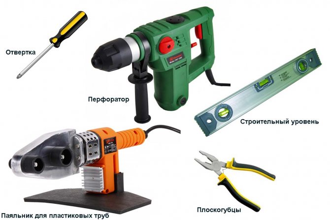 Инструменти, необходими за инсталиране на бойлера: бормашина с чук, поялник за пластмасови тръби, клещи, ниво на сграда и отвертка.