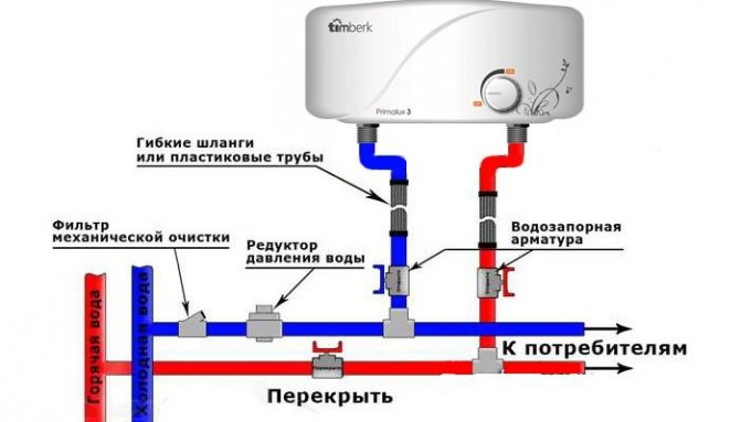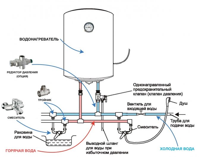 Ако в къщата влезе и тръбопровод с топла вода, тогава в допълнение към свързването на захранването към нагревателя от тръбопровода със студена вода, ще е необходимо да се инсталират две допълнителни спирателни кранове и един тройник.