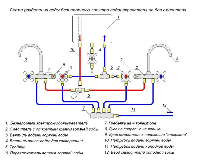 Ако има няколко точки за прием на вода, тогава ще е необходимо да се положат пластмасови тръбопроводи към тях и след това да се свърже маркучът от нагревателя към този тръбопровод.