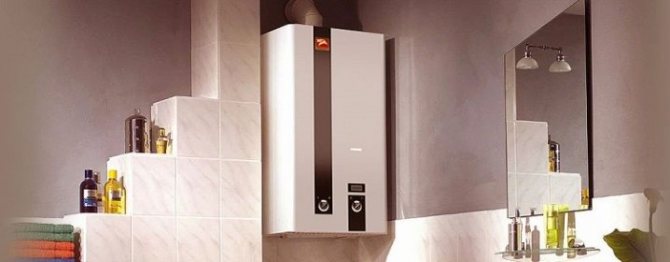 Използването на нагревателен апарат с мощност 20 kW в този случай се оказва донякъде неразумно поради по-голямата консумация на природен или бутилиран газ. Или трябва да закупите монтиран на стена двуконтурен газов котел с добри показатели за гореща вода.