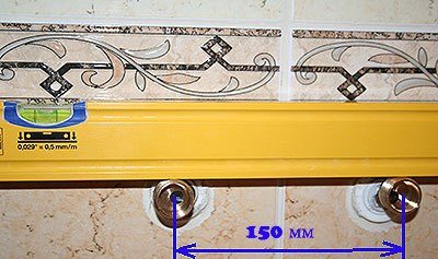 - Завъртайки ексцентриците с ключ, постигнете идеално централно разстояние между входовете от 15 cm... След това проверете хоризонталната инсталация с ниво на балон.