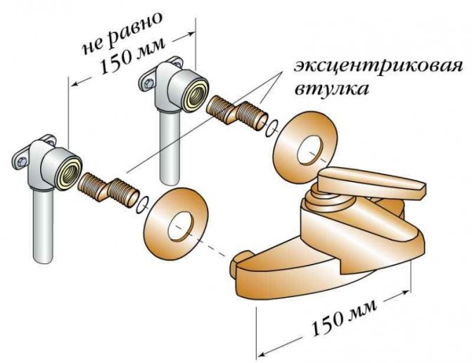 Важно! Разстоянието между входните отвори на корпуса на устройството не може да се регулира, поради което крайните тръби на тръбите трябва да бъдат позиционирани предварително на правилното разстояние, което зависи от модела на смесителя, но най-често равно на 150 mm.