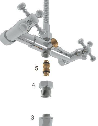 На задната страна на корпуса има два входящи отвора, които са разположени срещу отворите за монтиране на кранови кутии. На разклонителните тръби има съединителни гайки с уплътнения (1), поради което продуктът е свързан с водопроводите.