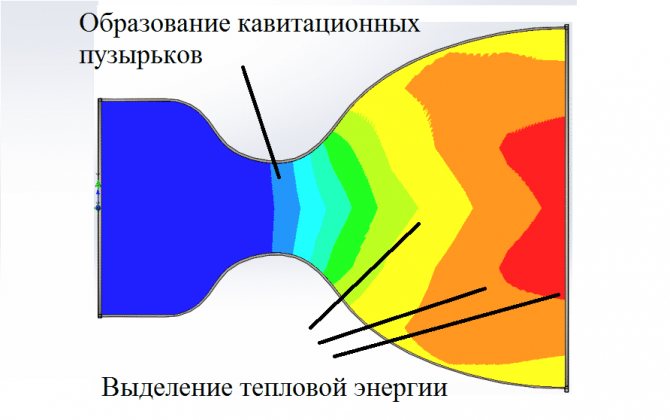 Освен това мехурчетата се отнасят от водния поток по тесните входни тръби на термичната инсталация. При преминаване в широка област, мехурчетата се срутват, освобождавайки топлинна енергия. Ултразвуковите кавитационни генератори също имат добри показатели, тъй като нямат въртящи се елементи.