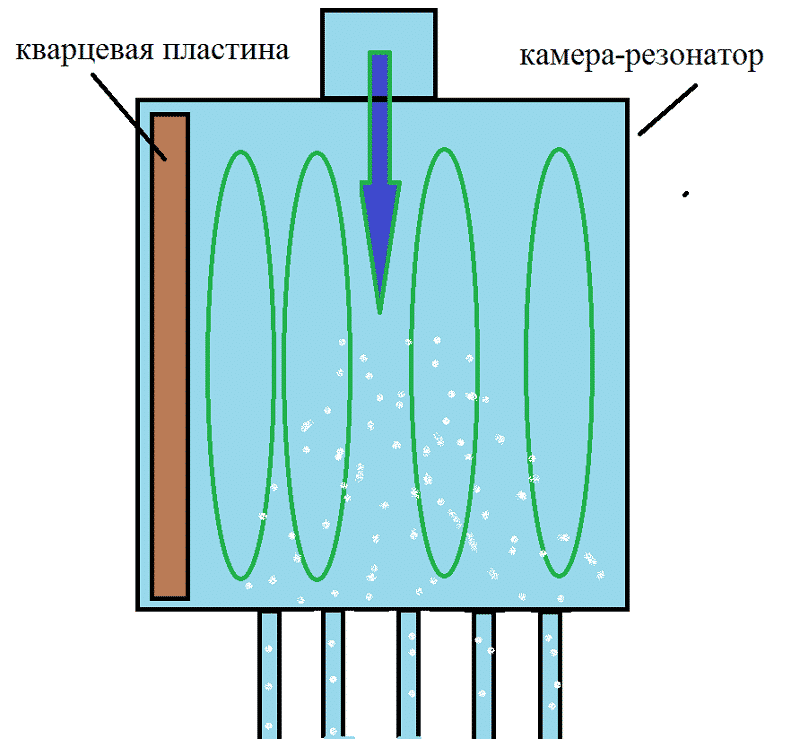 Този тип устройства имат резонаторна камера, настроена на определена честота на звукови вибрации. На входа му е монтирана кварцова плоча, която вибрира при подаване на електрически сигнали. Вибрацията на плочата създава ефект на пулсации вътре в течността, която достига до стените на резонаторната камера и се отразява. По време на обратното движение вълните се срещат с предни вибрации и създават хидродинамична кавитация.