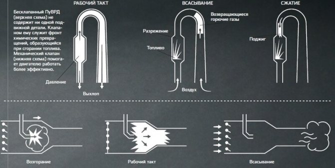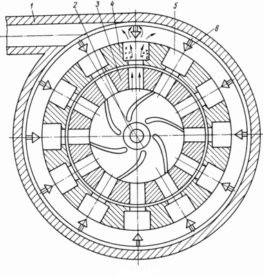 | Схема на подравняване на роторния пръстен (3) и статора (4) ... Диаграмата показва роторния пръстен и статора в момента на подравняване, когато роторният диск се върти. Тоест с всяка комбинация от тези елементи виждаме образуването на ефект, подобен на действието на тръбата на Ранке.
