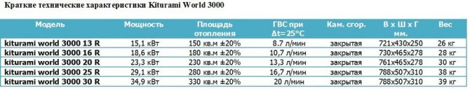 - Модел KITURAMI world 3000. С допълнително закупуване на дюзи, котелът може да бъде преобразуван, за да работи на намален газ. Котелът включва отделен меден топлообменник и коаксиален комин.
