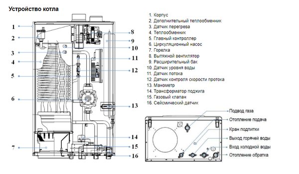 Основните конструктивни елементи на котлите са газовата горелка и топлообменника. Това са независими единици, но те работят по двойки и са структурно комбинирани.