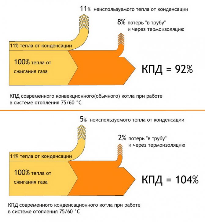 Неизползваната енергия се отнема от конвекционен (конвенционален) котел под формата на горещи димни газове, излизащи през комина (6–8%) и загуби на топлинна радиация (1–2%). Резултатът е ефективност от 90–94%.