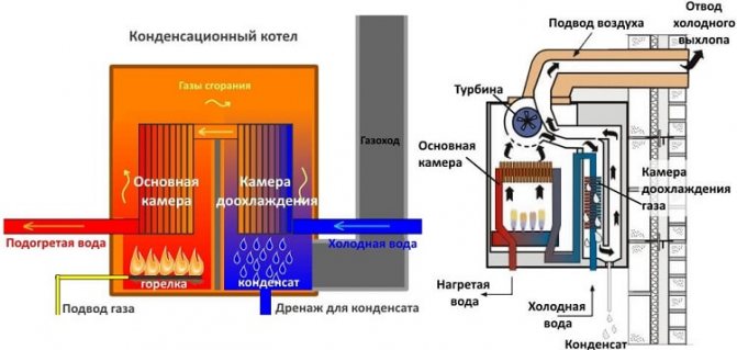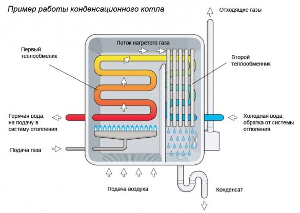 В първичния топлообменник, свързан с горивната камера, отделените газове се охлаждат до температура значително по-висока от точката на оросяване (всъщност така изглеждат конвенционалните газови котли с конвекция). След това димната смес се насочва принудително към кондензиращия топлообменник, където допълнително се охлажда до температура под точката на оросяване, т.е. под 56 ° С. В този случай водната пара се кондензира по стените на топлообменника, „отказвайки се от последния“. Кондензатът се събира в специален резервоар, откъдето тече по дренажната тръба в канализацията.