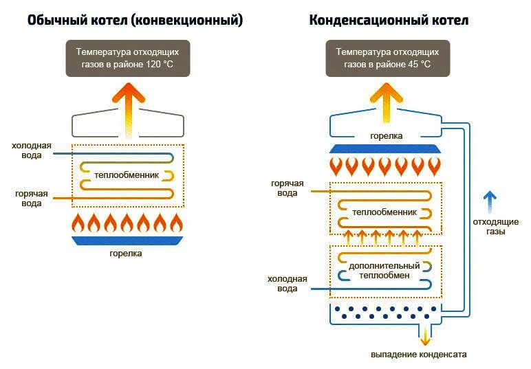 В конвекционен котел продуктите от горенето на природен газ CO2, азотни оксиди и пара се охлаждат само до 140–160 ° C. Ако ги охладите отдолу, тогава тягата в комина ще падне, ще започне да се образува агресивен кондензат и горелката ще изгасне.