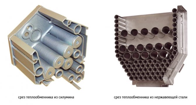 Кондензат - уви, не чиста вода, както мнозина вярват, а смес от разредени неорганични киселини. Концентрацията на киселини в кондензата е ниска, но като се има предвид, че температурата в системата винаги е висока, тя може да се счита за агресивна течност.Ето защо при производството на такива котли (и предимно кондензиращи топлообменници) се използват киселинно-устойчиви материали - неръждаема стомана или силумин (алуминиево-силициева сплав). Топлообменникът обикновено е направен отливен, тъй като заварените шевове са уязвимо място - там първо започва процесът на разрушаване на материала от корозия.