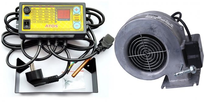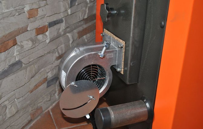 - вентилатор - инсталиран в дъното на котела, на вратата на подаващия въздух (вентилатор) или пепелника, той се използва за принудително подаване на въздух в горивната камера. Интензивността на горенето зависи от обема на входящия въздух.