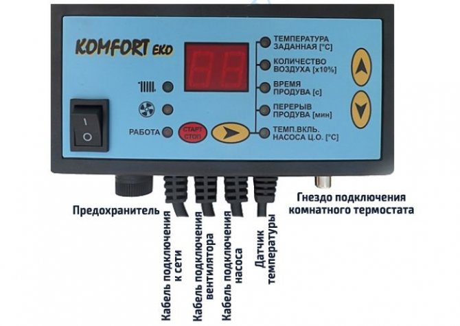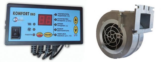 - контролер - електронен блок за управление, който задава скоростта на вентилатора. При максимална скорост на въртене максималният обем въздух се подава в горивната камера и се поддържа най-интензивното горене. Когато са зададени минимални изисквания за температура, минималната скорост на въртене на вентилатора се поддържа или се приема, че е напълно спряна.