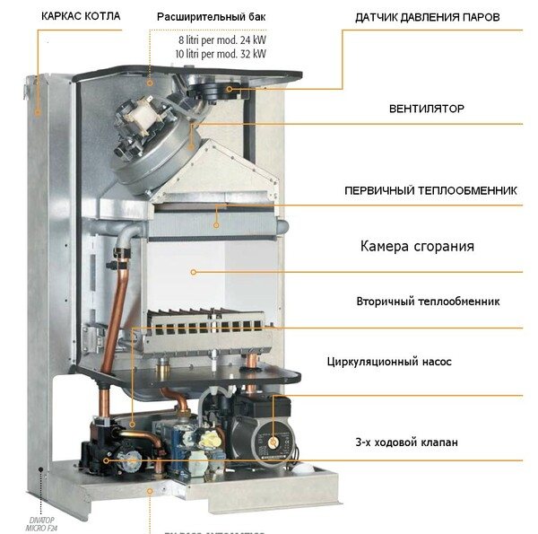 - Котел "Divatop Micro" с два контура може да се нарече напълно ново развитие. Продуктът включва голям брой иновации, които започнаха да влияят качествено на надеждната работа на устройствата и тяхната висока ефективност. Бяха инсталирани 2 медни топлообменника за загряване на водата и отоплителната система. Продуктът има трипътни инверторни клапани. Устройството може да поддържа необходимата температура за дълго време без външна намеса. Удобната система за самодиагностика ще осигури безопасността на устройството. Дизайнът Divatop Micro има отделна връзка с елемента Оскар, който е инсталиран в стаята, така че стаите да могат да бъдат климатизирани и отоплявани едновременно.