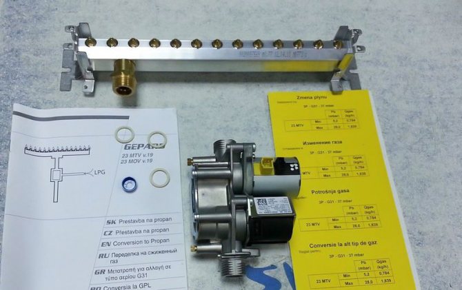 Ето как изглежда комплект за преобразуване на котел в втечнен газ. Може да се поръча с котела или да се закупи отделно. При някои модели заместващият комплект вече е включен в основната конфигурация.