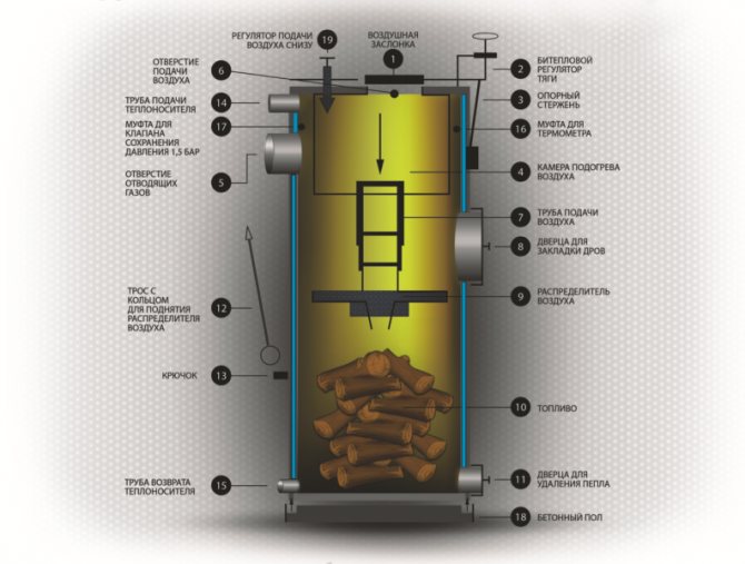 Най-простото решение би било стандартната конструкция на котел с долно изгаряне. Състои се от горивна камера, пепелник, водна риза или регистър, регулатор на тяга и комин. Ако изберете по-сложен дизайн, той може да има всякакви клапани, димни завихрители или минно горивни камери. Ако желаете, можете да направите котел дори с горен тип горене.