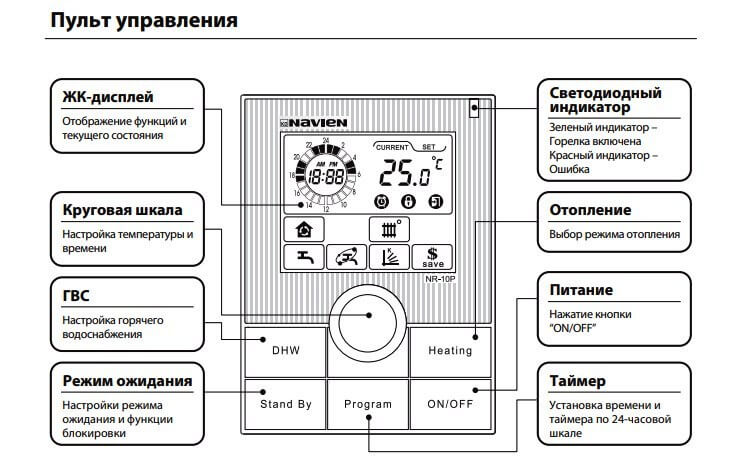 - Дистанционни.Котлите Navien са оборудвани със специални удобни дистанционни управления, с помощта на които потребителят може да променя режимите на работа на своето котелно оборудване от разстояние.