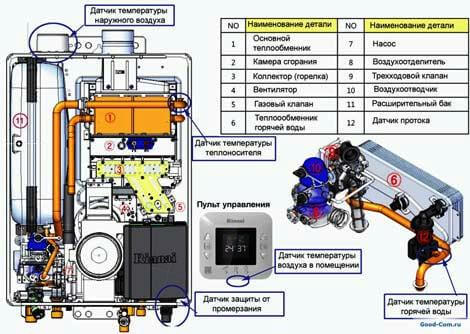 - Navien ACE-20AN, отопление -190 м2, естествено горене, максимална / минимална производителност - 20/9 kW, разширителен резервоар - да, електрическа помпа - да, отопление + захранване с топла вода, ефективност - 91%, топлообменник - плоча, газ консумация - 2,06 м3 / час, цена - 29 130 рубли.