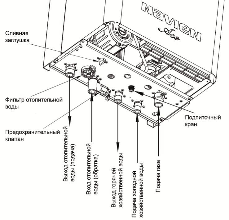 Групата за безопасност на котела Navien съдържа първични датчици за температура и налягане, контролен манометър и предпазен клапан срещу свръхналягане в топлозахранващата верига. За да се защитят вътрешните повърхности на нагряването на водата от котлен камък, е инсталиран филтър за пречистване на вода от соли на твърдост.