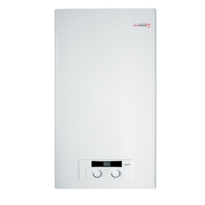 Proterm Lynx серия. Това са агрегати от кондензационен тип, горивната камера е затворена. Стенният газов котел от тази серия е едноконтурен модел с мощност 25 kW или 30 kW или двуконтурен модел с мощност 18 kW или 25 kW. Двуконтурният газов котел е снабден със система за независимо регулиране на температурата на течността в отоплителните и горещите водни кръгове. Поради технологията за извличане на топлина от димните газове, кондензационните агрегати се характеризират с повишена ефективност и по-икономично използване на горивото.