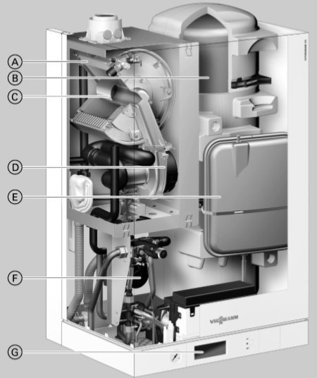 И - топлообменник от неръждаема стомана (Vitodesn 111-W е кондензен котел, поради което топлообменникът е направен от неръждаема стомана. В конвенционалните котли медта обикновено се използва като топлообменник) Б. - бойлер за БГВ. Предлага се от неръждаема стомана (Vitodens 111-W) или конвенционална въглеродна стомана с емайлирана облицовка. ° С - модулираща горелка. д - модулиращ вентилатор E - разширителен съд F - вградена помпа G - цифров контролер със сензорен дисплей