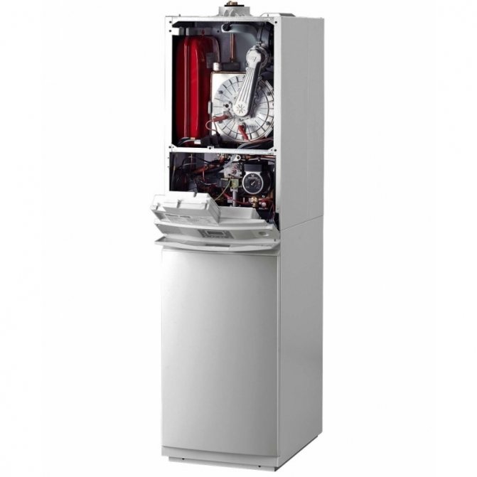 - Размерът на вградения котел рядко надвишава 60 литра. Подклас от такива котли може да се нарече стенни котли, които са предназначени за инсталиране на котел директно под тях. Такава инсталация прилича на хладилник. - Мощността на окачени котли с котел вътре не надвишава 35 kW. Това означава, че нишата за използване на такова оборудване не е най-голямата и повече за това по-късно.