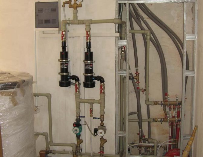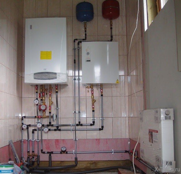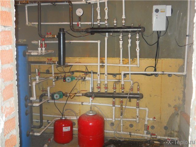 На входа е монтиран трипътен смесителен клапан, който ще регулира температурата. На връщащата линия е монтирана циркулационна помпа и е монтиран контролен блок. След тръбопровода можете да напълните системата с охлаждаща течност и да тествате работата на оборудването за коректност.