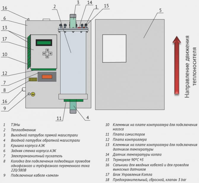- Термичен превключвател ... Изключва оборудването при прегряване. Свързан с термичния сензор, разположен в горната част на електрическия котел.