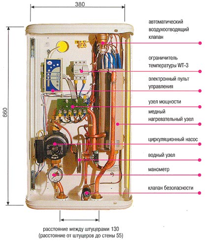 Всички нагревателни елементи са разположени в топлообменници, които се считат за основните структурни елементи на котела. В случай на тяхната неизправност, нагряването на охлаждащата течност е невъзможно.