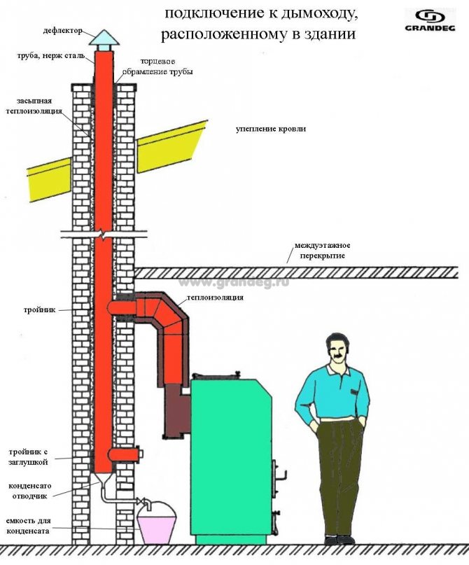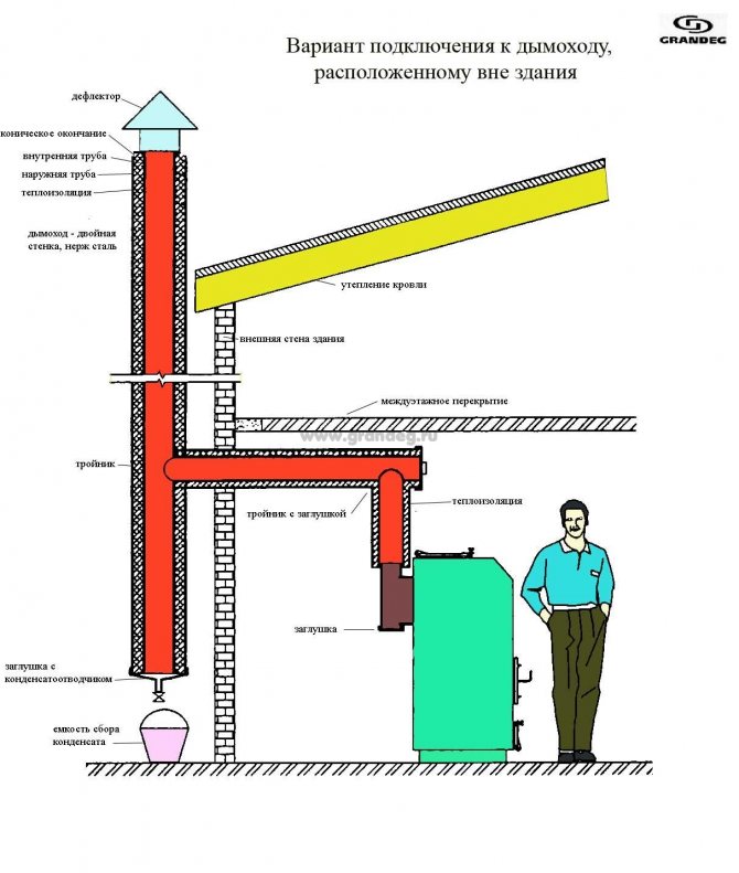 В този комин е инсталирано устройство, което ще отвежда кондензат. Правилният подход към монтажа на аспиратора ще гарантира защита срещу аеродинамично налягане или блокиране на тръбите.