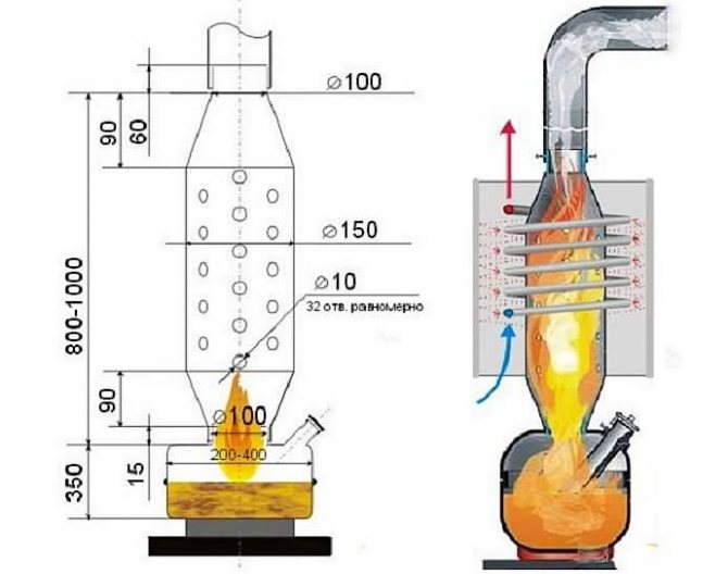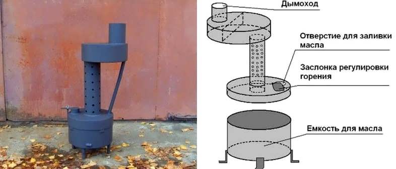 Стабилната и безопасна работа ще бъде осигурена от капковото подаване на отработено масло. Те са направени от стари цилиндри, както и метални листове. Продуктът е направен според вида на затвореното горене, тъй като в отворената версия горивото може да се запали, което ще доведе до опасна ситуация.