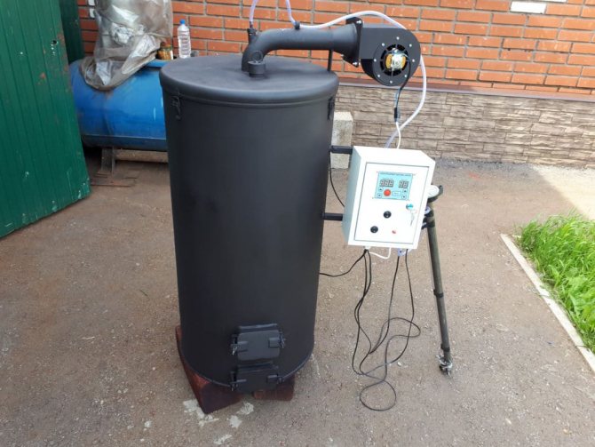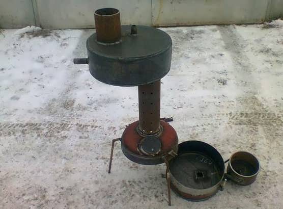 Една от схемите за отопление е използването на налягане за подобряване на производителността. Тук се използва специален вентилатор, който издухва въздуха вътре. Тогава парите се обогатяват с кислород, в горната камера се получава по-интензивно изгаряне. За производството се използва всеки съд от затворен тип, както и тръба с отвори, направени отстрани. Вентилаторът е инсталиран в горната част на устройството.