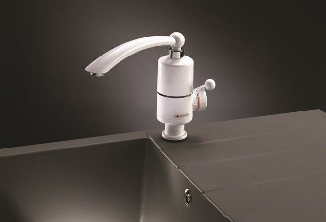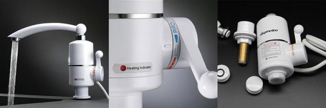- Отделна дюза за отопление. Устройството се поставя върху чучура на предварително инсталирания кран. Не е необходимо да се извършват сложни монтажни работи. Недостатъците на дюзата са ниска мощност, слабост на натиска. Устройството загрява не повече от 4 литра течност в минута. Компактните размери не позволяват комплектоване на нагреватели със сложни модули за безопасност. Има само термичен сензор, който не позволява изгарянето на нагревателния компонент.