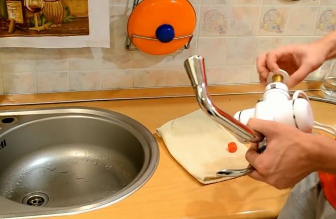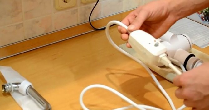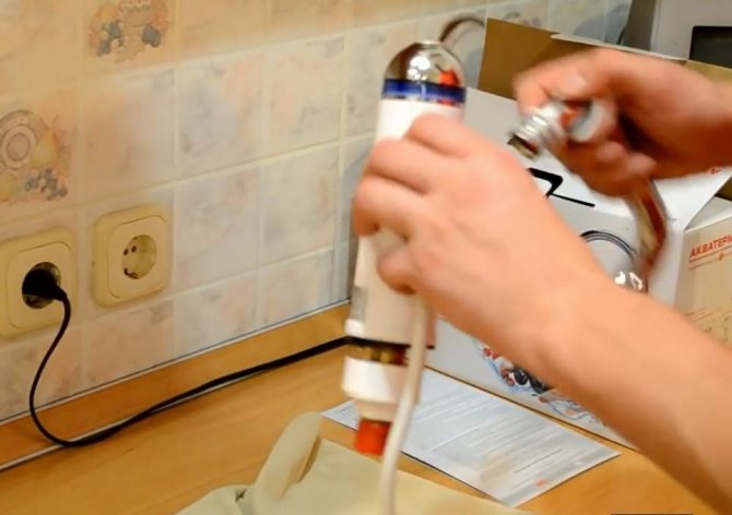 - Изключителна простота на инсталация, която не изисква промяна на системата, - достатъчно е да демонтирате смесителя на мивката и да инсталирате нагревател на кран на негово място, а също така да го свържете към мрежата, за 3 киловата, просто включете щепсела в контакта.