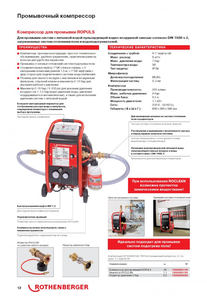 Висококачествените компресори могат да промиват не само отоплителната система, но и водопроводи, слънчеви колектори, както и системата за подово отопление.