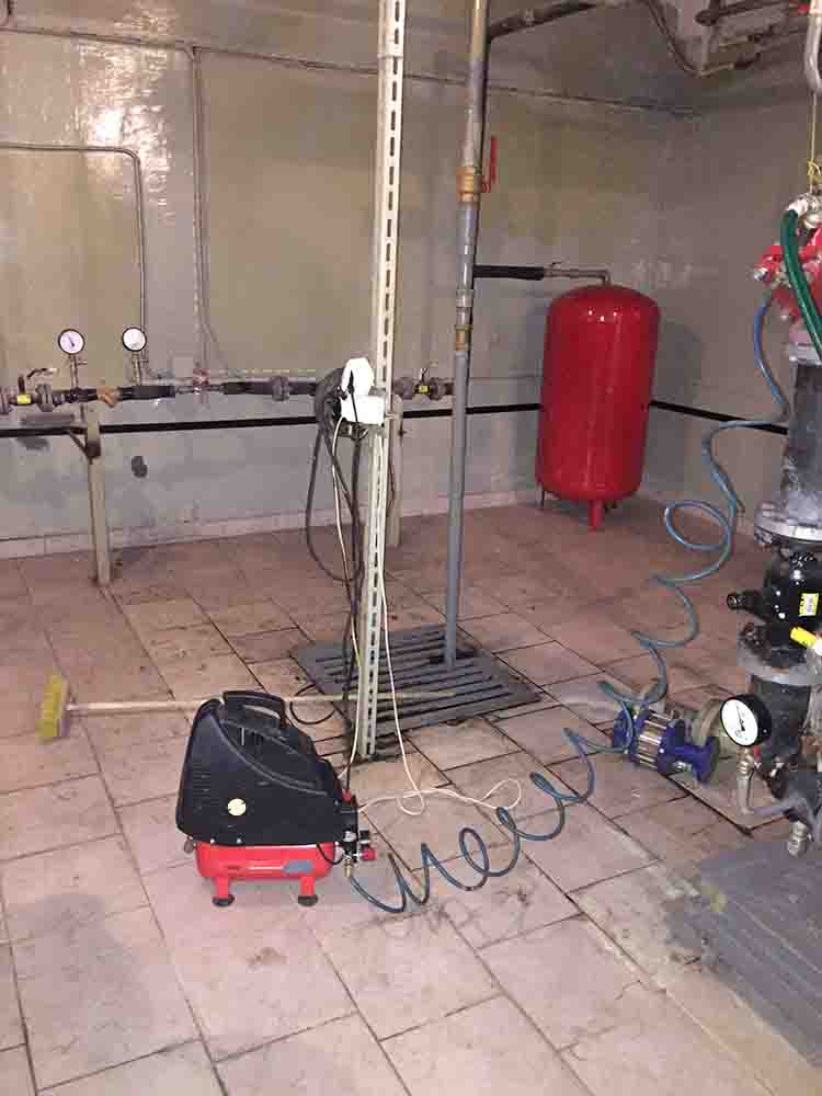 - Пълнене. Веригата се пълни с вода или химически реагент и се оставя за половин час. След това компресорът се включва и сгъстен въздух се подава към тръбите. След определен период от време затворете клапана на захранващата линия, отворете клапана и източете мръсната вода. Процедурата се повтаря, докато се появи бистра течност.