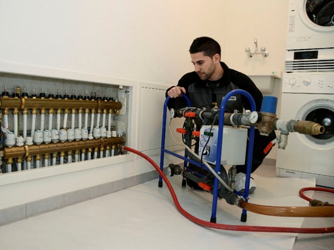 Такава работа се извършва с помощта на помпа за промиване на отоплителната система, изпомпване на химическа течност под налягане.