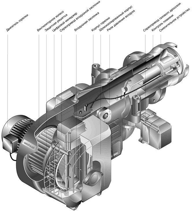 Встрани на горелката са вградени вентилатор, редуктор и система за автоматизация, с помощта на които се регулира газовата горелка.