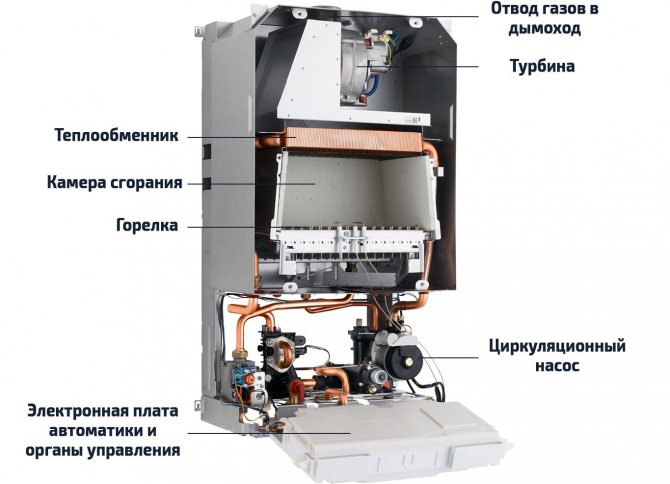 По-модерни модели, представляващи над 90% от пазара. Котел с турбокомпресор със затворена горивна камера има различен принцип на действие: той абсорбира кислорода от улицата, през коаксиален комин (външна тръба), а димът през него (вътрешната тръба) се отстранява навън - това напълно изключва входа на въздух от стаята, което ви позволява да не се притеснявате за вентилация.