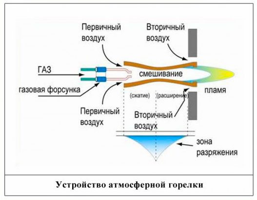 Силата на пламъка в атмосферна горелка зависи само от налягането в газопровода. Такава горелка обаче работи абсолютно безшумно.