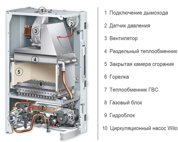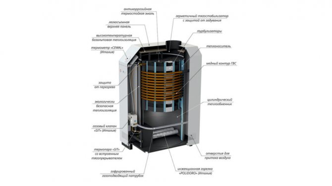 В долната му част е монтирана газова горелка, а под нея са разположени газов клапан, регулиращи устройства и свързващи тръбопроводи.... В горната част на топлообменника има проход за инсталиране на комин, който може да бъде с класически или коаксиален дизайн.