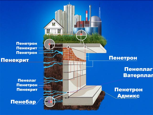 Penetron може да се използва за защита на основите от повърхностни и подземни води, отводняване на мазета и премахване на течове.