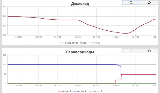 Графиката на температурата в комина дава представа за етапа, в който се намира TTC (запалване, активна пиролиза или изгаряне на останалото гориво) и, заедно с видеоклипа, получен от пиролизната камера, прави възможно да се направи заключение за състоянието на пиролизната камера и, ако е необходимо, дистанционно (чрез уебсайта) Коригирайте позицията на въздушните амортисьори, контролиращи качеството на изгаряне на горивото. Така например, 85 минути след стартиране на котела, отделянето на пиролизни газове в зоната, покрита от средния въздушен клапан, намалява, което води до намаляване на температурата на дима. След смяна на положението на амортисьорите, горната - от 0% на 48% и средната - от 100% на 50% (където 0 - напълно затворена, 100% - напълно отворена), температурата на димните газове отново се повиши.